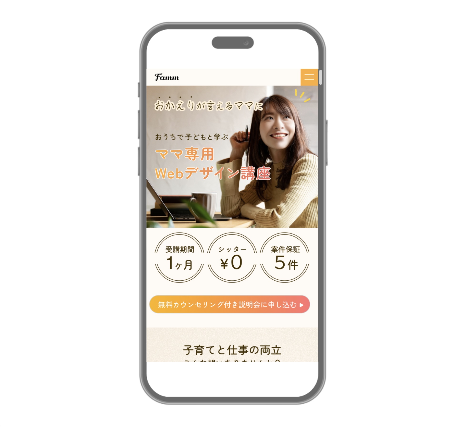 お客様からの信頼を得るために、私自身の名前をサイト名、ロゴデザインに含めました。ファーストビューをどの画面幅でもレスポンシブに対応し、スクロール時は以降のページコンテンツの土台として下に敷してあります。私のデザイン、仕事にかける想いを礎としました。